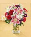 A sweet bouquet - and sweetly scented, too! Stargazer lilies, white stock and red roses offer a lovely fragrance as well as a lovely look... ...