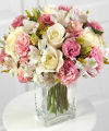 Cream and pink roses, pastel pink lisianthus and soothing white alstroemeria softly speak your affections...