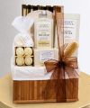 Our stylish wooden basket is full of relaxing lemongrass and ginger spa items...