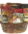 Basket features a dark rich color scheme and assortment of kosher foods...
