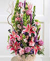 Superb stargazer lilies with lavender roses, pink variegated carnations, and liatris with Bells of Ireland are arranged in a bamboo dish garden... ...
