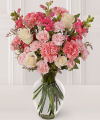 Rare beauties in a refined setting -- a vase of intriguing cream and white roses with pink snap dragons and pink carnations will spark their love for you...