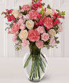 Rare beauties in a refined setting -- a vase of intriguing cream and white roses with pink snap dragons and pink carnations will spark their love for you...