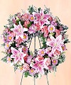 Stargazer lilies in this soft pink wreath remind you how special she was...